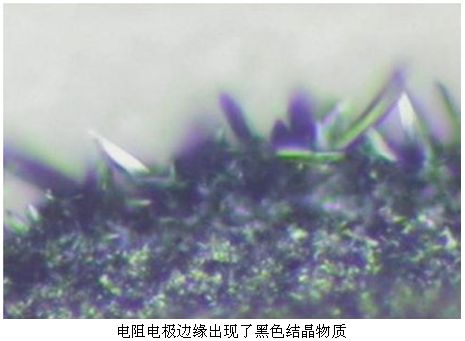 有一批現場儀表在某化工廠使用一年后,儀表紛紛出現故障。經分析發現儀表中使用的厚膜貼片電阻阻值變大,甚至變成開路了。把失效的電阻放到顯微鏡下觀察,可以發現電阻電極邊緣出現了黑色結晶物質,進一步分析成分發現,黑色物質是硫化銀晶體。原來電阻被來自空氣中的硫給腐蝕了!