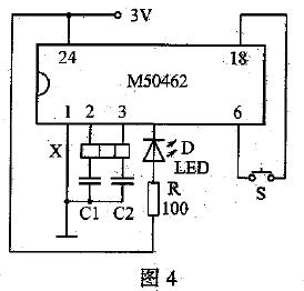 陶瓷振子檢測電路如圖4所示,外接元件455kHz或500kHz陶瓷振子X,C1、c2與集成電路M50462的2、3腳內部電路組成455kHz或500kHz的振蕩電路,將被測的455kHz或500kHz陶瓷振子插入插孔中,接通電源,按住按鈕開關S時,發光二極管能不停地閃爍發光,則說明被測陶瓷振子是好的。