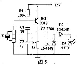 石英晶振檢測電路如圖5所示,BG與C1、C2、石英晶振X等組成高頻振蕩電路,C3、D1和D2組成二倍壓整流電路。將被測石英晶振插入插孔中,接通電源后,若發光二極管D3能持續發光,則被測石英晶振是好的。