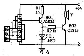 紅外線遙控接收器和紅外線遙控發射器的檢測電路如圖6所示。圖中Y是直徑為1cm,高為1cm左右的圓柱形小體積蜂鳴器,插孔的標號“+”、“-”表示遙控接收器的電源端,“o”表示遙控接收器的信號輸出端。若檢測一體化的三端紅外線遙控接收器,將被測遙控接收器的3只引腳插入對應的插孔中,接通電源,用一只好的紅外線遙控發射器對著遙控接收器,按住遙控發射器的任意按鍵時,若D1能閃爍發光,同時蜂鳴器Y發聲,則被測紅外線遙控接收器是好的。若要檢測紅外線遙控發射器的好壞,要將一只好的紅外線遙控接收器插入插座中,按下被測紅外線發射器的任何按鍵時,發光二極管D1都能閃爍發光,同時蜂鳴器發聲,則被測紅外線遙控發射器是好的。