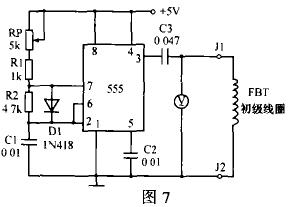 行輸出變壓器檢測電路如圖7所示,555集成定時器與外接元件構成多諧振蕩器。調節RP可產生12.5~25kHz的方波脈沖,由3腳經C3耦合輸出作為FBT初級線圈電諧振的激勵脈沖,C3與FBT初級線圈組成一串聯諧振電路。