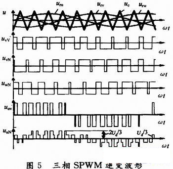 本文采用SPWM調制方式。圖2中,三相調制信號uru、urv和urw為相位依次相差120°的正弦波。a,b,c相自關斷開關器件的控制方法相同,現以a相為例:在uru>uc的各區間,給上橋臂電力晶體管V1以導通驅動信號,而給下橋臂V4以關斷信號。在uru<uc的各區間,給V1以關斷信號,V4以導通信號。圖5是三相橋式PWM逆變電路輸出三相對于負載中性點N的相電壓波形。