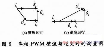 圖6是a相在整流運行、逆變運行時的相量圖。在SPWM調制方式下,電網電壓ua與ua產生的基波分量uao為正弦波,流過電感La的電流也為正弦波。圖6所示,從a相電路的相量圖可以很容易地看出,三相電壓源型PWM雙向變流器可以實現單位功率因數運行。
