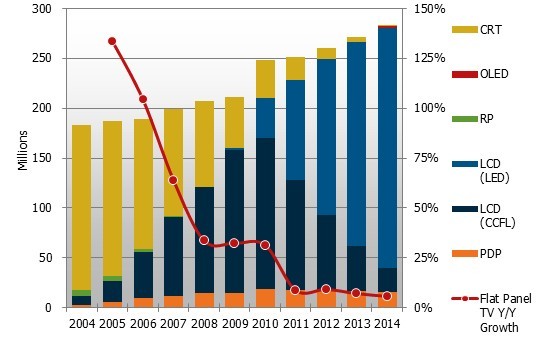 盡管2011年電視市場需求持平,但平板電視(不包含CRT技術和背投式技術)仍保有6%的年成長率。由于高端電視價格持續下降,加之廠商為了在新興市場快速更替CRT電視而采用低成本解決方案,預計2012年平板電視將成長9%。