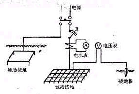 最初人們對接地電阻的測量是用伏、安法,這種試驗(yàn)是非常原始的。圖1是用安培計(jì)、伏特計(jì)的測量方法。在測定電阻時(shí)須先估計(jì)電流的大小,選出適當(dāng)截面的絕緣導(dǎo)線,在預(yù)備試驗(yàn)時(shí)可利用可變電阻R調(diào)整電流,當(dāng)正式測定時(shí),則將可變電阻短路,由安培計(jì)和伏特計(jì)所得的數(shù)值可以算出接地電阻。