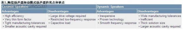 如今的便攜式設(shè)備需要更小、更薄、更省電的電子元器件。對于設(shè)計(jì)小巧的手機(jī),動圈式揚(yáng)聲器成為了制造商能否生產(chǎn)出超薄手機(jī)的制約因素。在這一需求的推動下,陶瓷或壓電揚(yáng)聲器迅速興起,成為動圈式揚(yáng)聲器的替代方案。陶瓷揚(yáng)聲器能以超薄、緊湊的封裝提供極具競爭力的聲壓電平(SPL),具有取代傳統(tǒng)的動圈式揚(yáng)聲器的巨大潛力。動圈式揚(yáng)聲器和陶瓷揚(yáng)聲器的區(qū)別如表1所示。
