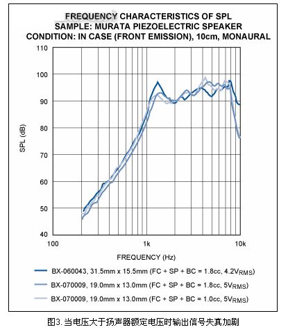 陶瓷揚(yáng)聲器制造商通常規(guī)定了揚(yáng)聲器的最大驅(qū)動電壓,典型值15VP-P。電壓最大時陶瓷器件的偏移量達(dá)到極限。外加電壓大于額定電壓時不會導(dǎo)致聲壓升高,反而增加了輸出信號的失真度。圖3為電壓最大時,陶瓷揚(yáng)聲器輸出聲壓(SPL)與頻率的關(guān)系曲線。通過對比SPL與頻率的關(guān)系曲線圖以及阻抗與頻率的關(guān)系曲線圖,可以明顯看出壓電揚(yáng)聲器產(chǎn)生高SPL時,在自激頻率處效率最高。