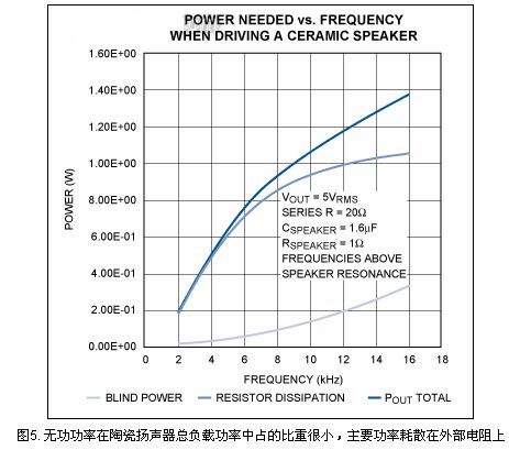 驅(qū)動10Ω串聯(lián)電阻的陶瓷揚(yáng)聲器時,總負(fù)載功率中無功功率占的比重并不大。大部分功率耗散在外部電阻上,圖5為放大器功率與頻率的關(guān)系曲線。