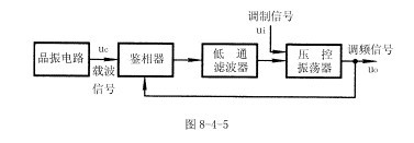 調頻波的特點是頻率隨調制信號幅度的變化而變化。由8-4-6式可知,壓控振蕩器的振蕩頻率取決于輸入電壓的幅度。當載波信號的頻率與鎖相環的固有振蕩頻率ω0相等時,壓控振蕩器輸出信號的頻率將保持ω0不變。若壓控振蕩器的輸入信號除了有鎖相環低通濾波器輸出的信號uc外,還有調制信號ui,則壓控振蕩器輸出信號的頻率就是以ω0為中心,隨調制信號幅度的變化而變化的調頻波信號。由此可得調頻電路可利用鎖相環來組成,由鎖相環組成的調頻電路組成框圖如圖8-4-5所示。