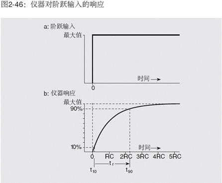 模擬儀器(或模擬輸出)的上升時間一般定義為輸入信號從零立即上升到某一固定值時,輸出信號從最終值的10%上升到90%所需要的時間。此關(guān)系示于圖2-46。圖2-46a示出假定上升時間為零的階躍函數(shù),而圖2-46b示出儀器的響應及相應的上升時間。單極點系統(tǒng)(1階系統(tǒng))的上升時間、頻率響應和RC常數(shù)是有關(guān)聯(lián)的。3dB點由下式給出: