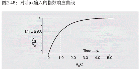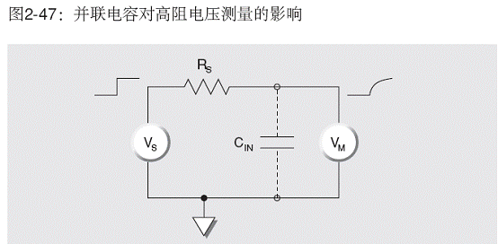 在對高阻抗源進行電壓測量時(圖2-47),電壓表(VM)兩端的電容(CIN)必須通過RS充電。輸出電壓對時間的函數(shù)關(guān)系為: