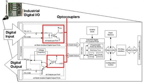 光耦合器,即基于光耦合原理的數(shù)字隔離裝置,是最古老也是最常用的數(shù)字隔離方法之一。它們可耐高壓并提供對(duì)電氣噪聲和磁噪聲的高抗干擾能力。光耦合器常用于工業(yè)數(shù)字I/O產(chǎn)品中,如NI PXI-6514隔離式數(shù)字I/O模塊(如圖10所示)和NI PCI-7390工業(yè)運(yùn)動(dòng)控制器。