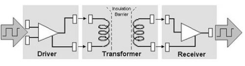 感應(yīng)隔離技術(shù)使用了一對(duì)通過(guò)一個(gè)絕緣層分離的線圈。該絕緣層防止任何物理信號(hào)的傳輸。信號(hào)可以通過(guò)改變流經(jīng)其中一個(gè)線圈的電流進(jìn)行傳輸,因?yàn)檫@樣會(huì)使跨過(guò)該絕緣層在第二個(gè)線圈中產(chǎn)生類似的感應(yīng)電流。感應(yīng)隔離技術(shù)可以提供與電容技術(shù)相似的高速傳輸。但是由于感應(yīng)耦合涉及到用于數(shù)據(jù)傳輸?shù)拇艌?chǎng)的使用,因此它易受到外部磁場(chǎng)的干擾。