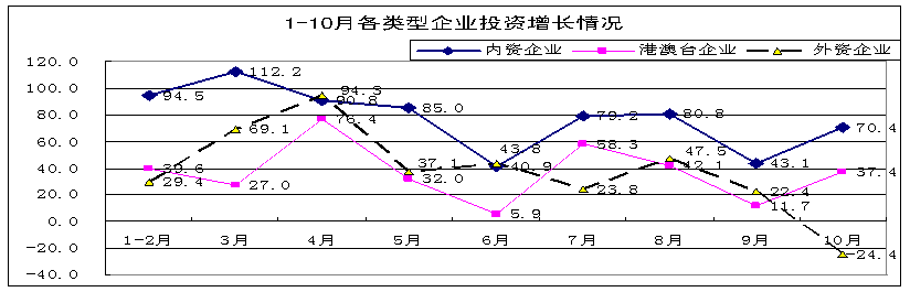 1-10月,內資企業完成投資5481億元,占全行業的74%,同比增長72.6%,高于全行業12.5個百分點,其中私營企業增勢突出,同比增長達100.9%。外商投資和港澳臺企業分別完成投資1065和815億元,同比增長30.8%和34.1%,低于全行業29.3和26個百分點,其中外商投資10月份下降24.4%。