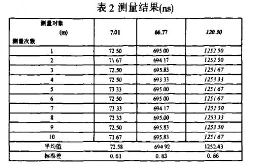 由關系式(2)可知,對已知材料的電纜,電纜長度L與發射脈沖與反射脈沖間時間間隔Δt成正比。通過對已知長度的電纜發射脈沖與反射脈沖的時間間隔進行測量,可以對時間間隔測量模塊的特性進行驗證。本文對長7.01m,66.77m和120.30m的電纜分別進行多次測量,測量結果如表2所示。