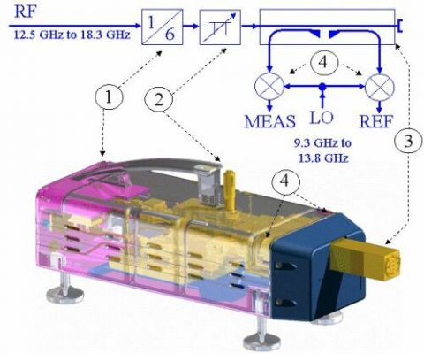 圖1顯示了R&S ZVA-Z110內(nèi)部的CAD結(jié)構(gòu)圖和原理框圖該變頻模塊包含用作隔離參考和測量信號的通道源倍頻器、可調(diào)節(jié)波導衰減器、定向耦合器這些參考和測量通道通過諧波混頻器進行下變頻