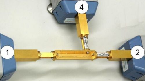 UOSM 校準技術(shù)的優(yōu)點是可以利用一個未知的直通件作為標準件這一未知的直通件僅要求具有很好的正、反向互易性,因此,該未知直通件不要求具有良好的匹配和低損耗特性甚至價格低廉的、帶帶標準法蘭盤的波導管節(jié)、波導彎頭和波導扭轉(zhuǎn)接頭,只要具有互易特性都可以作為直通件在校準后所有對輸出端口方向的改變都會造成(可避免的)精度損失,因此在這個例子當中,一個H面的波導彎頭在波導測試端口1和4,以及測試端口2和4之間建立直通波導測試端口1和2是通過兩個測試端口的直接連接而建立直通的