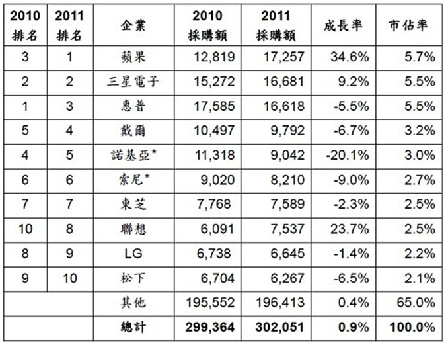 Gartner指出,蘋果在智慧型手機市場的市占率提升,平板媒體在2011年亦有亮眼業績。雖然2011年DRAM價格急遽下滑,許多PC業者緊縮整體半導體的需求,但隨著MacBookAir的成功,使蘋果PC事業對半導體晶片的需求增加。