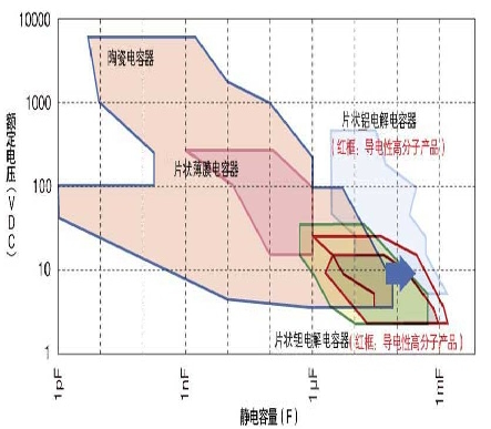 圖1:應用范圍不斷擴大的片狀獨石陶瓷電容器以額定電壓為縱軸,以靜電容量為橫軸