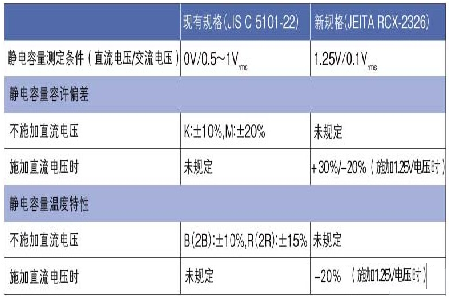 在靜電容量的測定上,新規格改為在施加1.25V直流電壓和0.1Vrms交流電壓的狀態下對容量進行測定。而原來的“JIS C 5101-22”規格并不要求施加直流電壓,只是要求在施加0.5~1Vrms交流電壓的狀態下對容量進行測定?! ?br />