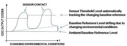 保持可靠性能。容性傳感器電極是采用PCB上的標準銅材料或柔性材料制成的。這種材料的特性會隨溫度和濕度的變化而發生改變。這種變化會使基線電平發生偏移(所有傳感器閾值電平均是以基線電平為參考的)。較大的基線偏移增加了接觸閾值電平過低或過高的風險(過低還是過高取決于基線偏移的方向)這會引起虛假的接觸誤差,或使閾值電平不是太靈敏就是不夠靈敏,導致接觸狀態的不穩定。為保持傳感器原始的信號接觸閾值檢測電平余量(靈敏度),CDC需要自動跟蹤基線偏移誤差的幅度,并對閾值設置進行相應的重新調整。圖2中的示例介紹了AD7147和AD7148的閾值電平如何針對因環境條件變化引起的基線失調變化進行自動跟蹤和調整。