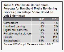 確實,基于核心用途,手持設備能夠向消費者提供優異的內容質量。即使如此,相機和游戲機等專用平臺的市場也在不斷萎縮,因為消費者現在渴望全能型產品,寧愿擁有這類多用設備,而不是擁有多個主要專注于一種內容呈現形式的設備。IHS公司認為,智能手機和平板電腦顯然屬于全能型的靈活設備,所以其受歡迎程度和銷量不斷上升。