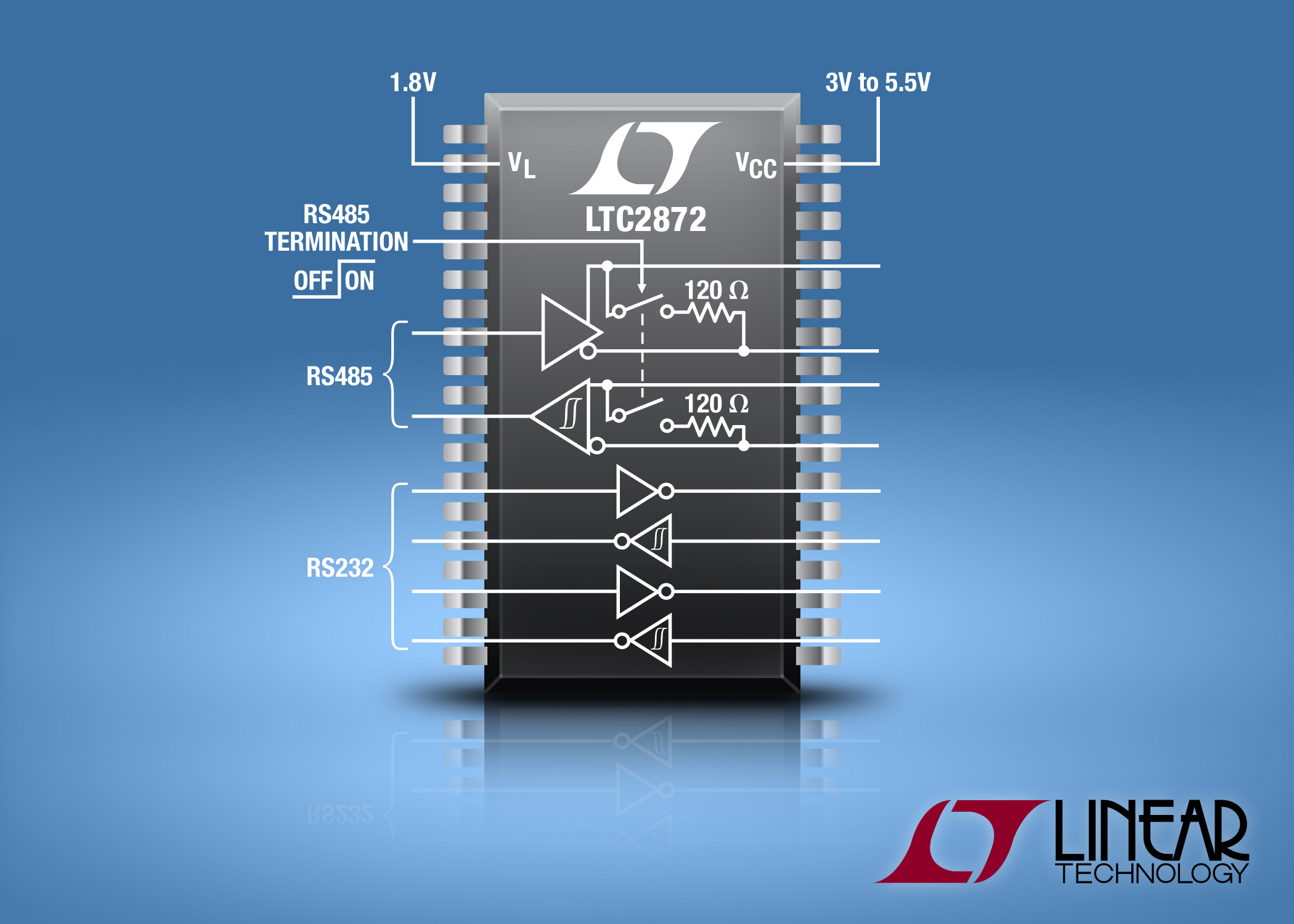凌力爾特公司 (Linear Technology Corporation) 推出適用于 3.3V 和 5V 系統并具可通斷集成型終端的多協議收發器 LTC2872。RS485 系統需要在通信總線的末端上布設一個終端電阻器,以最大限度地減少信號反射。LTC2872 集成了引腳控制型終端電阻器以簡化接口重新配置,從而免除了外部電阻器和控制繼電器。終端電阻器在啟用時可自動接通或斷開,以與收發器所選擇的協議 (RS232 或 RS485) 相匹配。該器件還擁有高 ESD 防護能力:在收發器總線引腳上可達 ±16kV HBM (在斷電或運作時)。LTC2872 可配置為采用共用 I/O 線路的 4 個 RS232 單端收發器或 2 個 RS485 差分收發器,或者此二者的組合,從而減少了多協議網絡的組件數目,并提供運行中的可配置性。