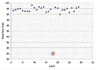 圖4最終測試良率(超負(fù)載試驗(yàn)前)和標(biāo)出不符合統(tǒng)計(jì)良率限值的點(diǎn)的示例圖。該點(diǎn)是一個(gè)異常值,是要求進(jìn)一步篩選和分析的風(fēng)險(xiǎn)點(diǎn),也可能會出現(xiàn)不合格品。