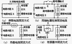 遠遠高于鋁聚合物電解電容器的紋波電流承受能力。必須考慮上電過程的沖擊電流限制。可以采用AC/DC變換器上電電流限制方法,如串聯限流電阻,見圖2(a),則: