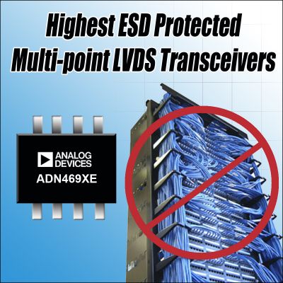 Analog Devices, Inc. (NASDAQ:ADI),全球領(lǐng)先的高性能信號(hào)處理解決方案供應(yīng)商,最近推出一系列多點(diǎn)、低電壓、差分信號(hào)(M-LVDS)收發(fā)器ADN469xE,具有所有多點(diǎn)LVDS收發(fā)器中最高的ESD(靜電放電)保護(hù)。 ADN469xE M-LVDS系列包含八款收發(fā)器,每款器件都能夠利用一條差分電纜對(duì)連接32個(gè)數(shù)據(jù)/時(shí)鐘節(jié)點(diǎn)并以100 Mbps或200 Mbps的數(shù)據(jù)速率工作。與之相比,傳統(tǒng)的LVDS通信鏈路必須使用32個(gè)單獨(dú)的點(diǎn)對(duì)點(diǎn)節(jié)點(diǎn),這會(huì)顯著增加功耗、連接器尺寸、線纜成本和總電路板空間。ADI公司的ADN469xE M-LVDS系列可提供8 kV IEC ESD保護(hù),是M-LVDS收發(fā)器競(jìng)爭(zhēng)產(chǎn)品的11倍。這種更高層次的保護(hù)能夠提高可插拔板和卡的可靠性,適合無線基站和網(wǎng)絡(luò)基礎(chǔ)設(shè)施、數(shù)據(jù)采集、自動(dòng)測(cè)試設(shè)備以及其他高速、高度網(wǎng)絡(luò)化背板和電纜應(yīng)用。