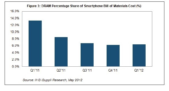 據(jù)IHS iSuppli公司的DRAM動態(tài)簡報,雖然智能手機的材料清單(BOM)成本穩(wěn)步上升,但一年來DRAM在其中所占的份額卻下降了一半以上,主要是因為DRAM價格下跌。