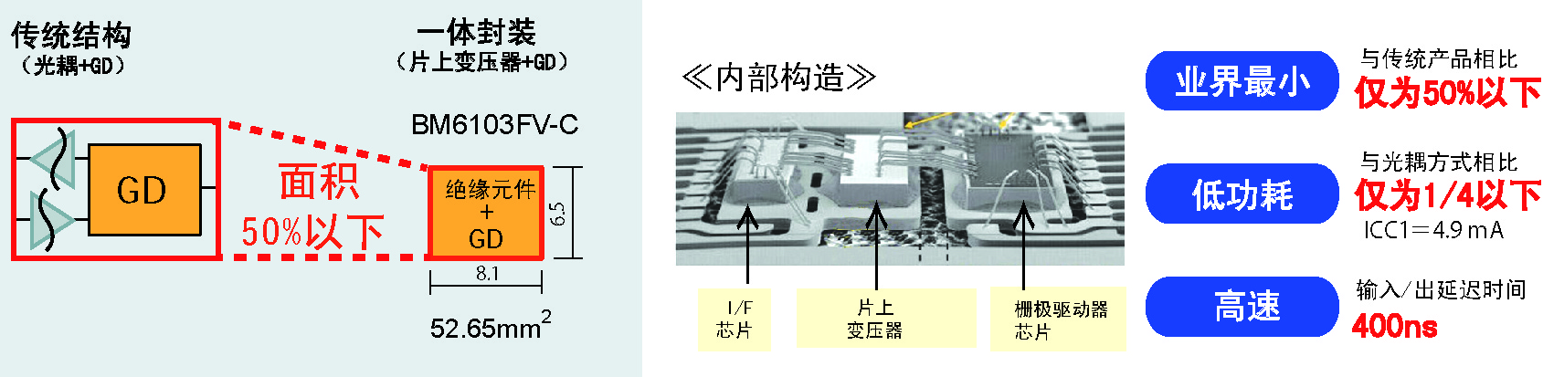 此次羅姆采用獨創的微細加工技術,開發出片上變壓器工藝,進而成功開發出小型并且內置了絕緣元件的柵極驅動器。無需外置零件,同時通過采用小型封裝,與傳統產品相比,安裝面積減少了約50%。不僅如此,由于內置車載逆變器電路所需的全部保護功能,不僅有助于實現逆變器的小型化,還非常有助于減輕設計負擔。