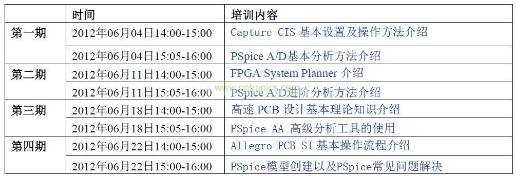 課程分為四期,內(nèi)容包括Capture CIS、PSpice、FPGA System Planner 以及Allegro PCB SI 培訓(xùn)。