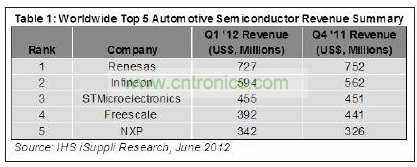 瑞薩電子的汽車半導體營業(yè)收入為7.27億美元,遙遙領(lǐng)先于其它競爭對手。排在其后的廠商是德國英飛凌、法國-意大利企業(yè)意法半導體、美國飛思卡爾半導體和荷蘭恩智浦半導體,如表1所示。