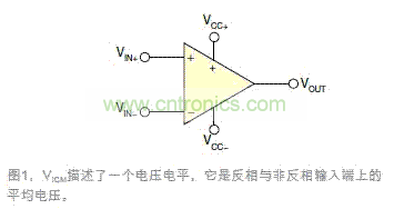 認識VICM還有一種方式,即它是非反相和反相輸入端VIN+與VIN-的公共的電壓電平。在大多數應用中,VIN+非常接近于VIN-,因為閉環負反饋會使一個輸入端密切跟蹤另一個輸入端,使VIN+與VIN-之間的壓差接近于零。很多共模電路都是這種情況,包括電壓跟隨器,以及反相和非反相配置。這些情況下,通常會假設VIN+=VIN-=VICM,因為這些電壓幾乎是相同的。