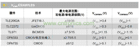 有一個寬輸入范圍的特例值得一提,這就是軌至軌輸入運放。盡管這個名稱暗示該運放的輸入可以跨越整個電源軌的區間,但并非像人們可能假設的那樣,所有軌至軌輸入器件都可以覆蓋整個電源范圍。很多軌至軌輸入的運放(如TI的OPA333)確實能跨越整個電源區間,而其它一些則達不到標準,說明有誤導性。同樣,關鍵在于查看數據表指定的輸入區間規格。