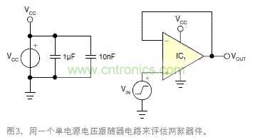 為更好地理解違反VICMR的效果,下面給出一些實例。用兩只具有不同VICMR規格的運放可演示這些效果。這些器件都有軌至軌的輸出,排除了輸出級造成的限制。一個單電源的電壓跟隨器電路用于兩只器件的評估(圖3)。所有測試均在一個實驗臺上完成,室溫約為25°C。