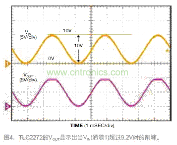 測試電路時,在其輸入端加一個直流偏移為VCC電壓一半(或5V)的300Hz正弦波。調 節交流幅度,直到看到VOUT有一個變化。當施加10V峰峰值輸入時,VOUT顯示一個接近正電源軌的削峰信號,而不是接近負電源軌。這個接近正電源軌的不良性能就是預計輸入超過9.2V時的結果。對于0~9.2V之間的VIN,VOUT顯示和預期一樣的正確波形(圖4)。