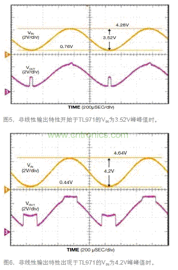 VIN中心在2.5V時,VIN增加到2.7V峰峰值,VOUT都有預期的線性特性。當VIN增加到約3.5V峰峰值時,中心在2.5V,VOUT繼續跟隨VIN,表現出正確的運放特性。注意這個線性特性好于數據表對VICMR的限制,但仍然超出了保證的極限值。當VIN增加到略高于3.52V峰峰值時,VOUT開始在接近正電源5V軌和負電源0V軌時表現出非線性特性(圖5)。VIN進一步增加到4.2V峰峰值,明顯超出了VICMR。當輸入峰值超過了近正電源軌的極限時,VOUT的信號輸出超出電源軌,跳到正電源軌5V以上,并停留在這里,直到VIN回到可接受范圍內(圖6)。當輸入跌到接近負電源軌的極限以下時,VOUT的信號表現出一個相位反轉,跳至中軌2.5V,并以一個偏移跟隨VIN,直到VIN增加到VICMR內的一個可接受電壓值。