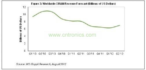 2012年第二季度DRAM營(yíng)業(yè)收入為70億美元,比第一季度的63億美元?jiǎng)旁?1%,如圖1所示。這是DRAM產(chǎn)業(yè)自2010年第二季度以來(lái)首次增長(zhǎng),上個(gè)季度的營(yíng)業(yè)收入是四年來(lái)的第三低水平。廠商對(duì)下滑局面得到扭轉(zhuǎn)感到高興,盡管第二季度營(yíng)業(yè)收入遠(yuǎn)低于2010年同期的90億-100億美元。