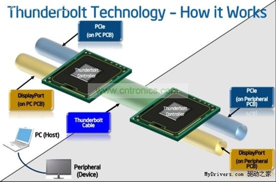 Thunderbolt接口由一顆Intel控制芯片驅(qū)動(dòng),通過(guò)PCI-E x4、DisplayPort總線與系統(tǒng)芯片組相連,也可以直接連接Intel處理器內(nèi)集成的圖形核心進(jìn)行DisplayPort輸出。