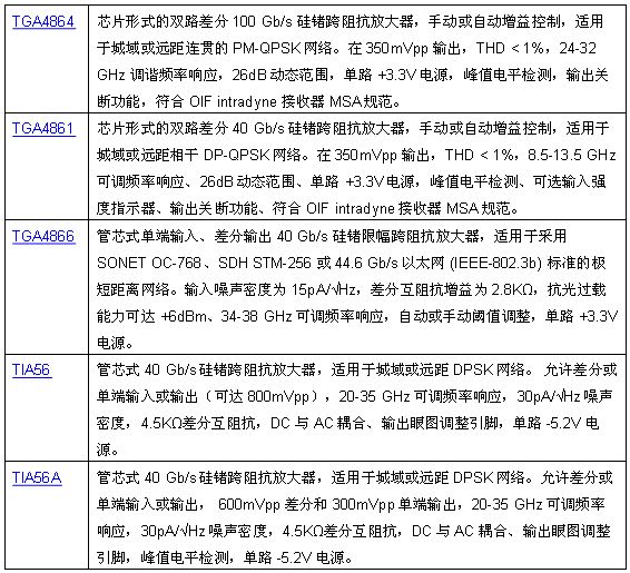 TriQuint五款新型跨阻抗放大器,擴展光纖市場