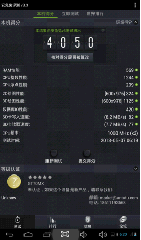 AnTuTu Benchmark是一個專門給Android設(shè)備的手機(jī)、平板電腦硬體打分的軟件,,通過“內(nèi)存性能”、“CPU整數(shù)性能”,“CPU浮點(diǎn)性能”、“2D、3D繪圖性能”、“數(shù)據(jù)庫IO”、“SD卡讀、寫速度” 等性能測試對手機(jī)的硬體性能做出評分。