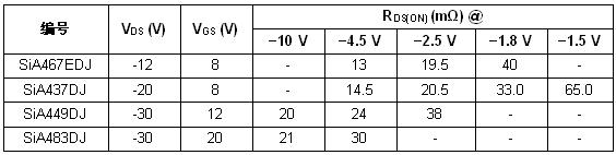 開(kāi)關(guān),以及智能手機(jī)、平板電腦、移動(dòng)計(jì)算設(shè)備、硬盤(pán)驅(qū)動(dòng)器和固態(tài)驅(qū)動(dòng)的同步降壓轉(zhuǎn)換應(yīng)用里的控制開(kāi)關(guān),-12 V SiA467EDJ提供了13m?(-4.5V)的極低導(dǎo)通電阻。-20V SiA437DJ的導(dǎo)通電阻為14.5m?(-4.5V),-30V SiA449DJ和SiA483DJ的導(dǎo)通電阻分別只有20m?(-10V)和21m?(-10V)。另外,SiA437DJ和SiA467EDJ的電流等級(jí)高達(dá)30A,承受很大的涌入電流,可用于負(fù)載開(kāi)關(guān)。