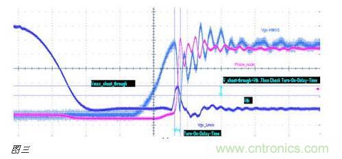 測試的目的是看上MOS管導(dǎo)通時,有沒有同時把下管打開,從而導(dǎo)致電源直接導(dǎo)通到地而引起短路。如圖三所示藍色曲線(Vgs_Lmos)就是下管在上管導(dǎo)通的同時,被帶了起來,如果藍色曲線的被帶起來的尖峰超過了MOS管的Vth要求,同時持續(xù)時間(Duration)也超過了datasheet要求,從而就會有同時導(dǎo)通的風險。當然,這是大家最常見到的情況。