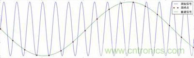 簡單溫習奈奎斯特采樣定理:如果信號是帶限的,且采樣頻率Fs高于信號最高頻率Fmax的兩倍,采樣樣本中完整地保留了原始信號中的信息。而高于或等于采樣頻率的一半頻率分量,則會導致混疊現(xiàn)象,如圖 5所示由于采樣頻率過小,每個信號周期樣本數(shù)量太少,重建后的波形頻率分量落到低于采樣頻率的頻率范圍中,與原始信號大相徑庭。