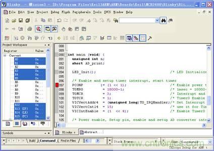 在程序窗口(包括C語言、匯編和反匯編窗口)中, 用鼠標(biāo)雙擊需要設(shè)置斷點的程序行,則在窗口左邊的狀態(tài)條中出現(xiàn)紅色的斷點標(biāo)志如圖2所示,完成設(shè)置斷點操作。再次用鼠標(biāo)雙擊該程序行,窗口左邊的紅色斷點標(biāo)志消失,則為刪除斷點操作。
