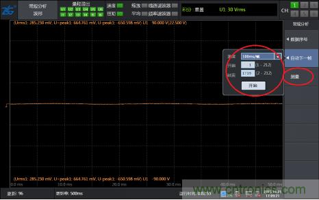 第三步,點擊圖 3菜單中“測量”區域,使界面出現“測量”字樣,此時儀器界面中的波形會停止刷新。然后通過“自動下一幀”菜單,選擇要查看的波形幀數,可以選擇從第一幀開始,到最后一幀介紹,然后設定每一幀的回放速度(從人眼的反應考慮,建議選擇200ms/幀以上),點擊開始之后,界面中的波形會進行回放,當看到想要看的波形后按停止按鍵,然后通過“數據序號”來調整波形,確??吹阶约合胍牟ㄐ?,如圖 4所示;