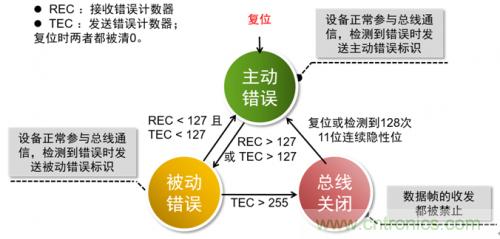為了避免某個設備因為自身原因(例如硬件損壞)導致無法正常收發數據而不斷地破壞數據幀,從而影響其他正常節點通訊,CAN-bus規范中規定每個CAN控制器都有一個發送錯誤計數器和一個接收計數器。根據計數值不同CAN節點會處于不同的設備狀態,狀態之間的轉換關系見下圖: