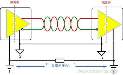 隔離收發器可將總線和控制電路進行電氣隔離,將高壓阻擋在控制系統之外,可以有效地保證操作人員的人身及系統安全。不僅如此,隔離可以抑制由接地電勢差、接地環路引起的各種共模干擾,保證總線在嚴重干擾和其它系統級噪聲存在的情況下不間斷、無差錯運行。如圖 1所示,使用隔離收發器后,可以有效防止形成地環路,總線參考地可跟隨共模電壓的波動而波動,共模電壓全部由隔離帶承受,共模電壓對總線信號變得不再可見,從而保證總線穩定可靠地通信。